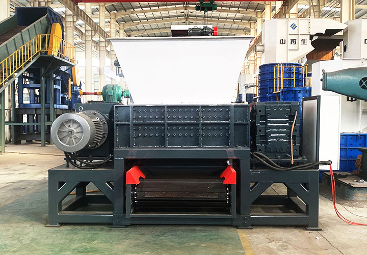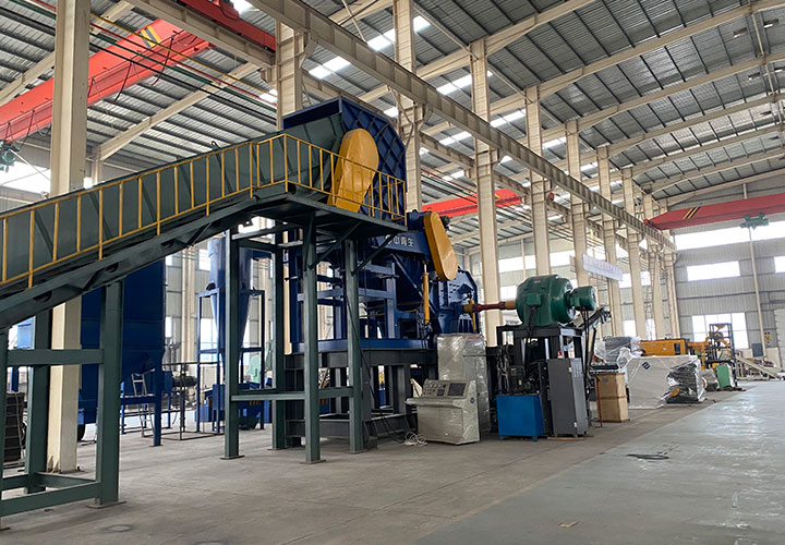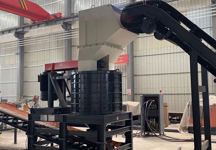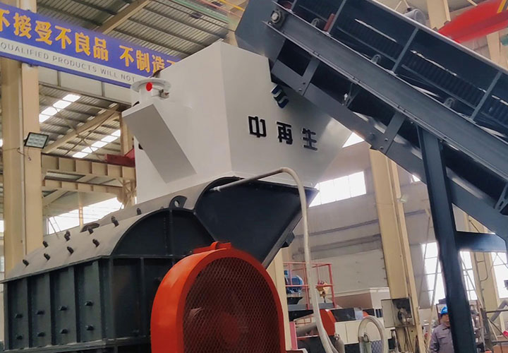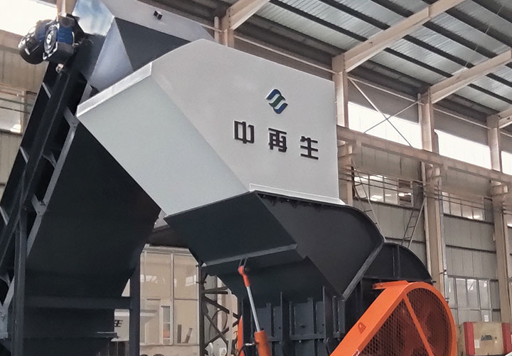 破碎線主機(jī)殼體采用特厚鋼板制造,內(nèi)襯為高錳鑄鋼件,可更換;主機(jī)轉(zhuǎn)子盤(pán)安裝于水平軸上,轉(zhuǎn)子盤(pán)圓周分布有銷軸,軸向懸有錘頭;主軸用滾珠軸承支撐,循環(huán)油強(qiáng)制潤(rùn)滑冷卻,并裝有溫度傳感器;進(jìn)料口裝有液壓輥筒喂料裝置,位置一高一低,同向旋轉(zhuǎn),能將大件松散物料壓扁,送入破碎腔內(nèi)。