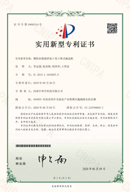 ZL2019216192870銅鋁水箱破碎加工用上吸式磁選機